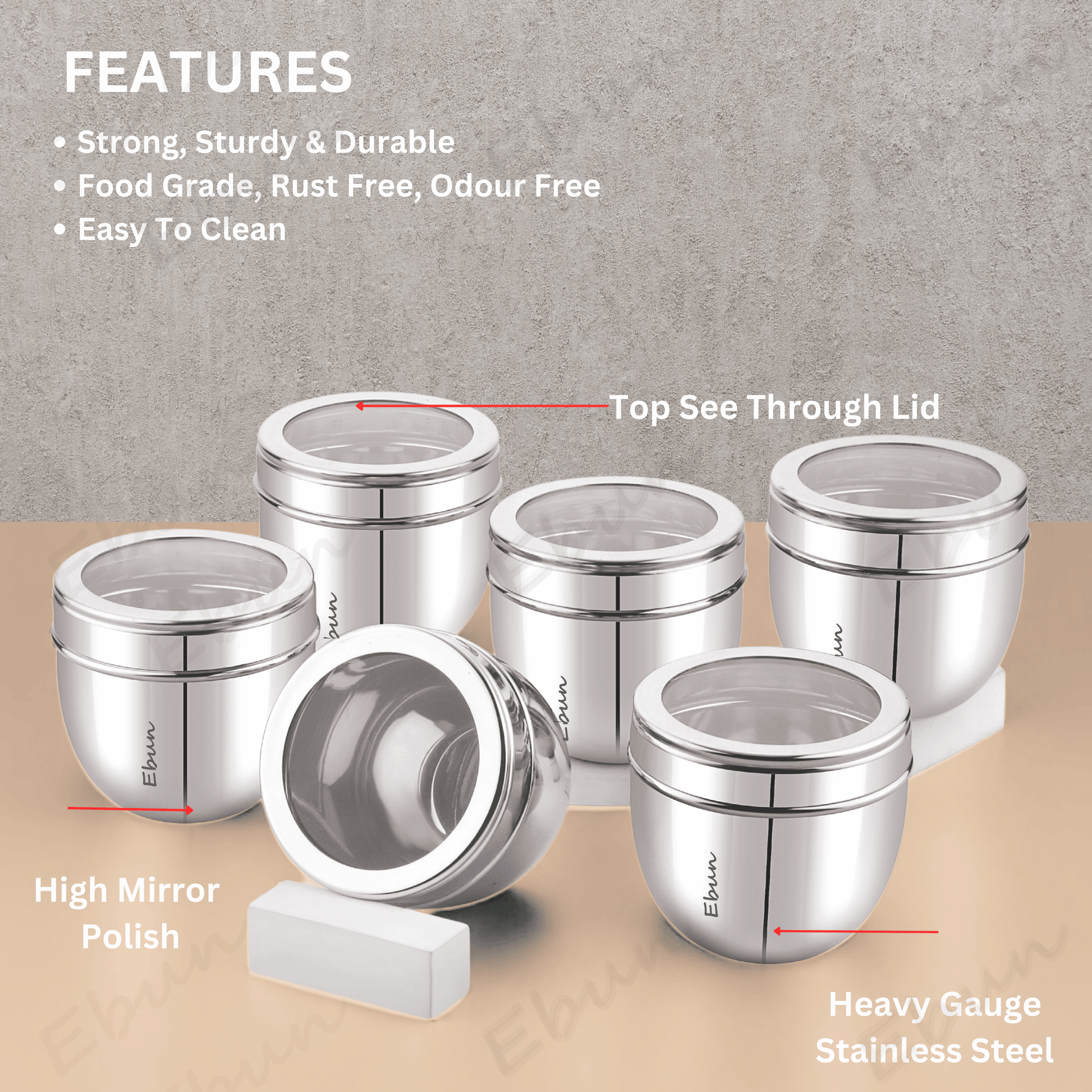 Ebun Stainless Steel See Through Containers Bring Style, Durability and Convenience to your Kitchen. Designed in an Elegant Conical Shape, The Top See Through Lid allow you to Quickly Identify the Contents Inside without having to Open the Jar. Made From Heavy Gauge, Food Grade Stainless Steel, They are Perfect for Storing Spices, Masalas, Dry Fruits, Tea, Coffee and Everyday Essentials. This 6 Piece Combo Set Offers Versatile and Space Saving Storage for Every Modern Kitchen. Overall, The Ebun Stainless Steel Multipurpose See Through Containers is a Practical and Stylish Addition to any Kitchen. Whether you're a Professional Chef or a Home Cook, These Containers are perfect for Storing and Organizing your Kitchen Essentials.